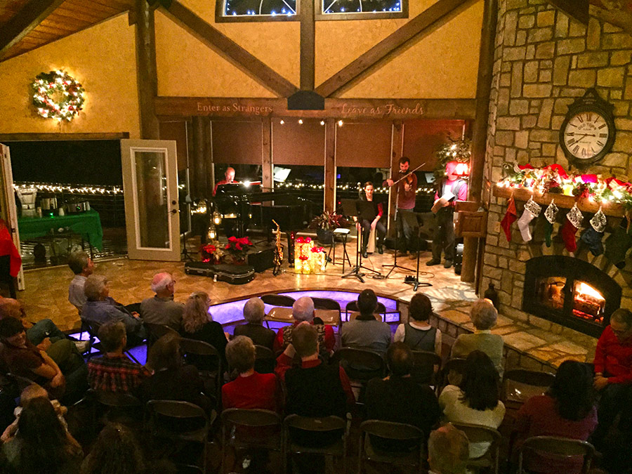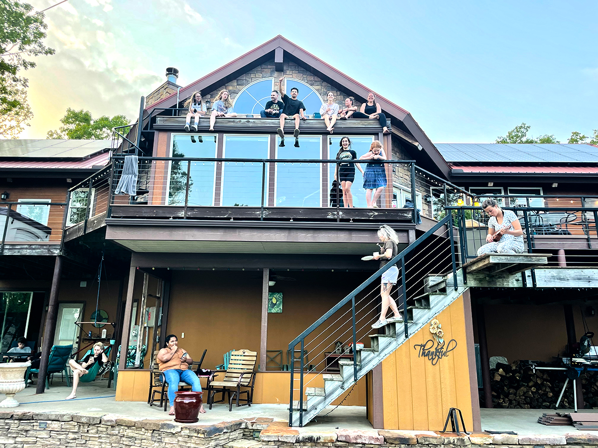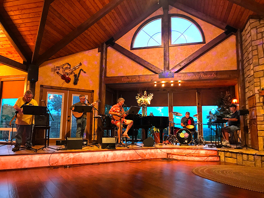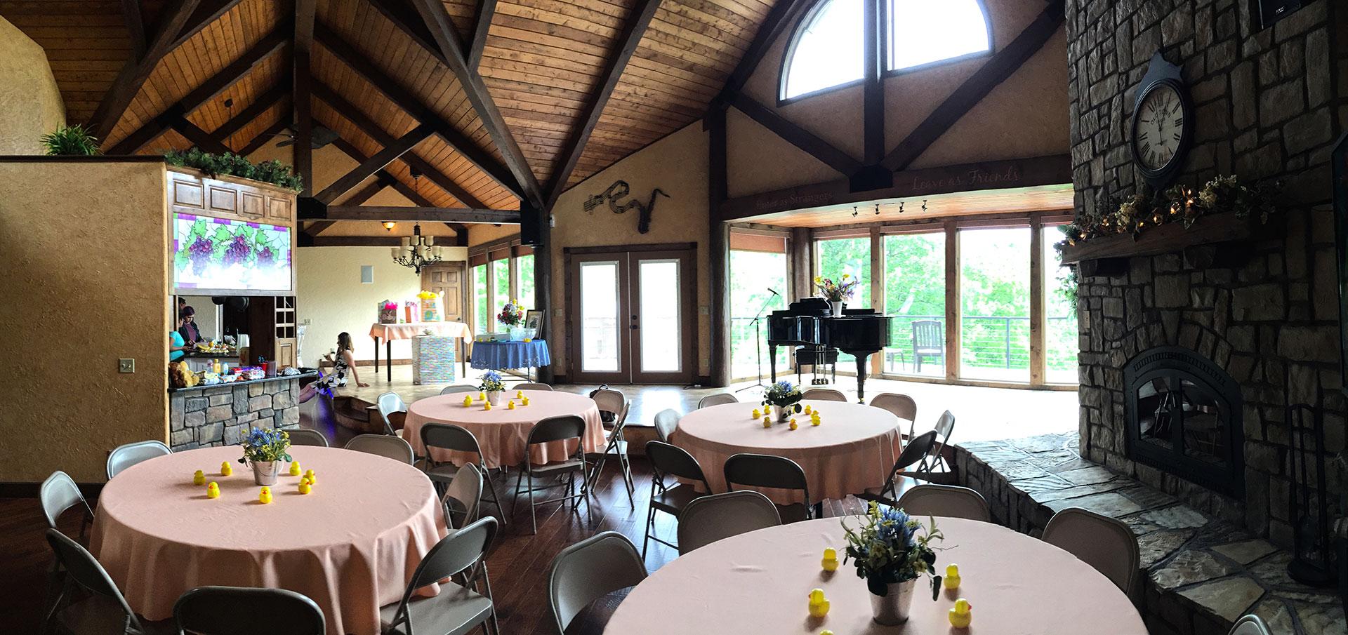Timber Ridge Lodge is approximately 3600 sq. ft. on two levels. The main floor has two bedrooms, two bathrooms, and a full kitchen with a dining room open to an expansive great room with a grand piano and fireplace. The room is equipped with a 24 channel sound board with speakers. There is also a large screen television that can be used for presentations. Downstairs has a third bedroom and full bathroom. There is a home theater with a 10′ screen, also downstairs. The theater has internet streaming options as well as a Blueray/DVD player. It seats 12 to 15 people. Also downstairs is a recreation room with a second fully equipped kitchen, a regulation sized 9′ pool table, and a state of the art massage chair. Here are some pictures of the indoor spaces and some events happening in them: