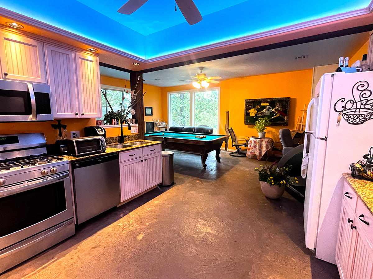 Recreation Room with 12′ wide sliding glass doors that open to swimming pool